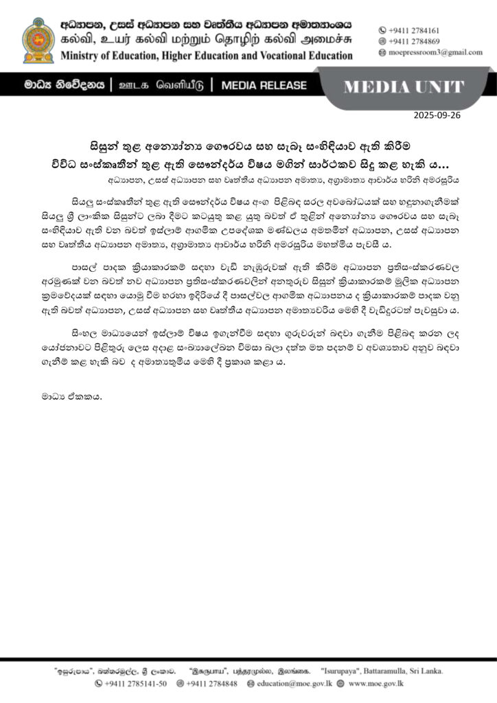 The Prime Minister and the Minister of Education, Higher Education and Vocational Education, Dr. Harini Amarasuriya, addressing the Islamic Religious Advisory Board, stated that all Sri Lankan students should be provided with a simple understanding and recognition of the aesthetic components present within all cultures, and that through this, mutual respect and genuine reconciliation could be established.
