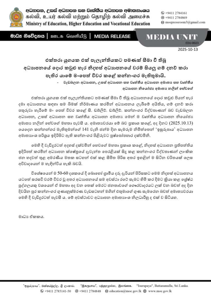 He made these remarks on October 13, 2025, during the 141st birth anniversary commemoration of Mr. Kannangara, after offering floral tributes at the Kannangara statue located in front of the “Isurupaya” premises of the Ministry of Education.