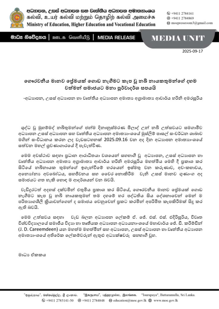In line with the Milad Un Nabi the commemoration ceremony of the birth of Holy Prophet Nabi, a program organized by the Muslim Schools Development Branch of the Ministry of Education was held today (16.09.2025) at the auditorium in the seventh floor of the Ministry of Education.
