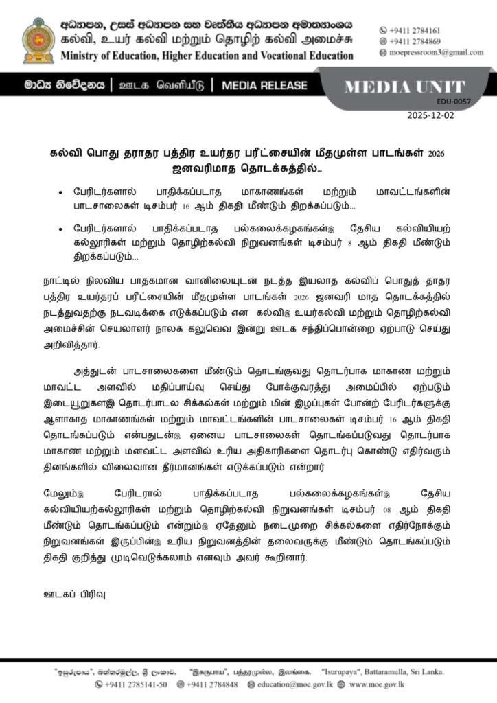 நாட்டில் நிலவிய பாதகமான வானிலையுடன் நடத்த இயலாத கல்விப் பொதுத் தாதர பத்திர உயர்தரப் பரீட்சையின் மீதமுள்ள பாடங்கள் 2026 ஜனவரி மாத தொடக்கத்தில் நடத்துவதற்கு நடவடிக்கை எடுக்கப்படும் என கல்வி, உயர்கல்வி மற்றும் தொழிற்கல்வி அமைச்சின் செயலாளர் நாலக கலுவெவ இன்று ஊடக சந்திப்பொன்றை ஏற்பாடு செய்து அறிவித்தார்;.